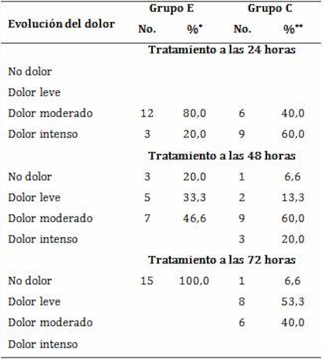 Al analizar la evolución del dolor en función del tiempo (tabla 2), a las 24 horas se obtuvo que 60,0 % de los pacientes que recibieron paracetamol refirió dolor intenso, mientras que solo 20,0 % de los tratados con láser dijo sentir dolor en esa escala, para una diferencia significativa (p˂0,05). A las 48 horas aún persistía el síntoma de forma intensa en 20,0 % del grupo de control, en tanto en el de estudio todos sentían dolor moderado o leve o no lo presentaban, lo cual resultó significativo (p˂0,05). Pasadas 72 horas había remitido el dolor en todos los pacientes tratados con láser, pero no sucedió así en los que consumieron paracetamol, pues solo 6,6 % no lo padecía, de modo que existieron diferencias significativas entre ambos grupos (p=0,00).