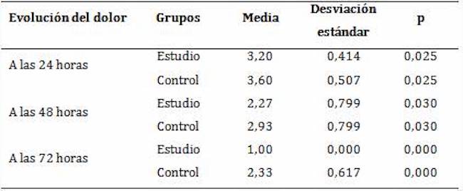 El análisis de los estadígrafos de ambos grupos reveló cambios significativos a las 24 y las 48 horas (tabla 3), pues la variación de las medias y la desviación estándar fueron notables, con p˂0,05. A las 72 horas se observó una variación más significativa en los grupos (p꞊0,00), tanto en la media como en su desviación.