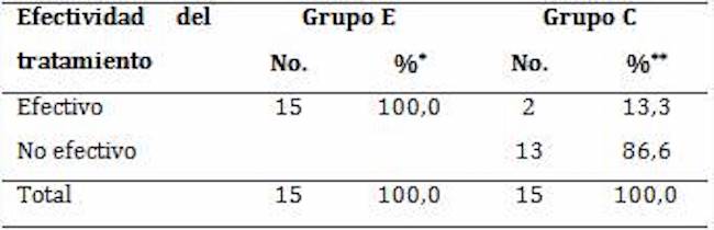 Resultados: Existieron diferencias significativas en cuanto a la remisión de la intensidad del dolor, pues el síntoma estuvo ausente o en grado leve en todos los integrantes del grupo de estudio luego de tres sesiones terapéuticas (p=0,00), mientras que solo 13,3 % de los pacientes del grupo de control se ubicaron en estas dos categorías.