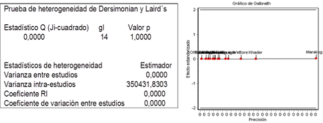 En el análisis de heterogeneidad realizado mediante la prueba de Dersimonian y Laird, se alcanza un Ji al cuadrado de 0,00, una p = 1,00 y se acepta la hipótesis nula (Ho) de que no existe heterogeneidad en los resultados. Como este test representa una baja potencia, debido a que se considera una muestra pequeña, además, la falta de heterogeneidad no significa homogeneidad, se procedió entonces a realizar el gráfico de Galbraith y se corroboró que los estudios son homogéneos al plantear que la enfermedad periodontal ocasiona, en asociación con otras variables, el parto pretérmino y el bajo peso al nacer, puesto que visualmente, los estudios se encuentran ubicados cerca del eje de las abscisas y ninguno de ellos se sale de las bandas de confianza (fig. 1).