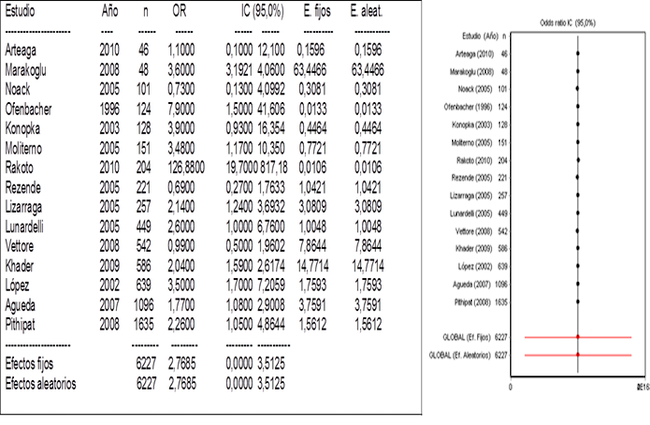 Para estudiar la combinación de efectos, en la figura 2 se puede observar que el efecto de los estudios analizados mostró, que de un modo combinado no existió variabilidad interestudio (efectos aleatorios) ni intraestudios (efectos fijos). A pesar de que el OR global para ambos efectos fue mayor que uno, el intervalo de confianza no incluye la unidad, razón por la cual se puede pensar que, aunque los estudios tuvieron criterios de inclusión semejantes, la influencia de las variables asociadas diversas pudo influir en la confiabilidad de los resultados.