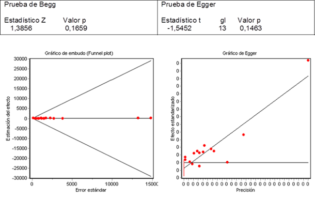 Al observar la figura 3 (Funnel plot) se observa que todos los estudios quedan incluidos dentro del embudo y se distribuyen simétricamente en torno a la estimación global del efecto, lo que es indicativo de ausencia de sesgo de publicación. Esta prueba tiene muy poca potencia cuando el número de estudios es pequeño, como ocurre en este caso, por lo que se realiza la prueba de Egger donde se aprecia la nube de puntos cercana a la diagonal distribuidos simétricamente en torno a la estimación global del efecto, lo cual confirma la ausencia de sesgo. Para reforzar estos resultados la prueba de Begg y de Egger muestran una significación estadística mayor de 0,05 por lo que se acepta la hipótesis nula (Ho) de que no existe sesgo de publicación.