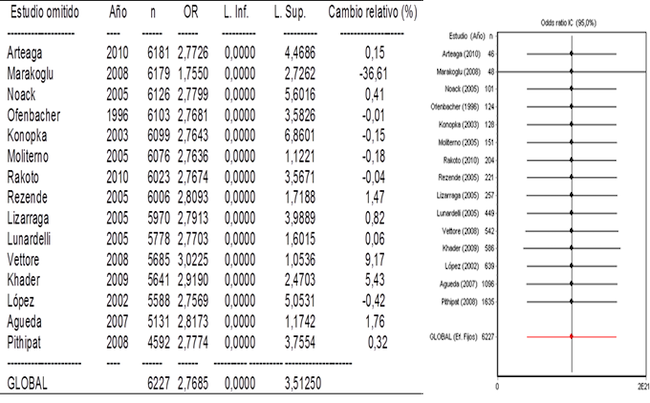 Finalmente, el análisis de sensibilidad pretende conocer la influencia de cada uno de los estudios en la estimación global del efecto y, por tanto, la robustez o estabilidad final obtenida. Para realizar esta prueba se omite cada estudio, a fin de tomar en consideración cómo varía el resultado final. En la figura 4 se observa la magnitud de todos los estudios y la dirección de estos donde no son semejantes a la del efecto global, no siendo, además, significativa la variación de los estudios, pues el intervalo de confianza en todos incluye a la unidad (OR= 2,76 IC (0,00 - 3,51), lo cual demuestra que los resultados no son robustos. Esto permite arribar a la hipótesis de que el PPBP están determinados por la enfermedad periodontal, pero en dependencia de las variables que en las madres se encuentren asociadas.