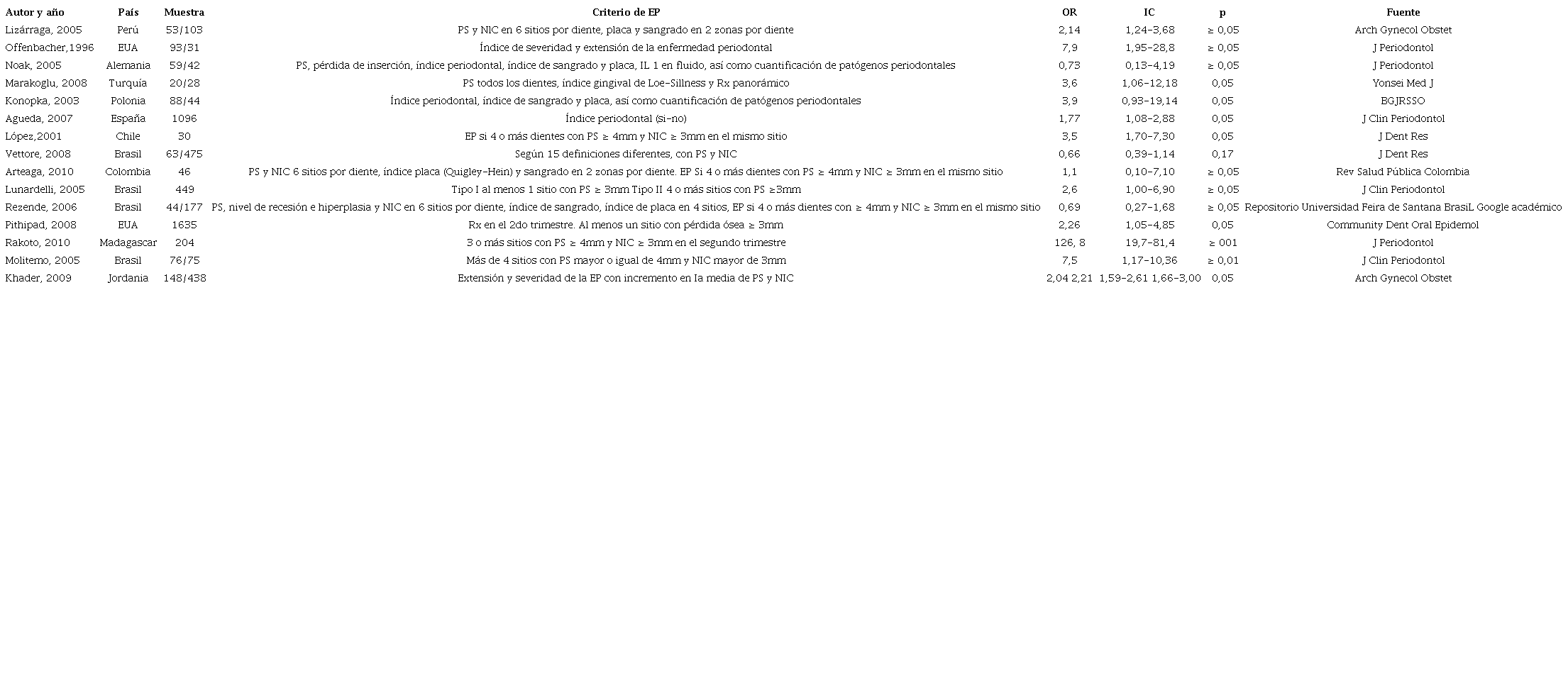 Por su parte, Vettore et al16) realizan su estudio a través de 15 definiciones diferentes y solo con una logran asociación causal, lo que demuestra que el OR varía según la definición de enfermedad periodontal utilizada.