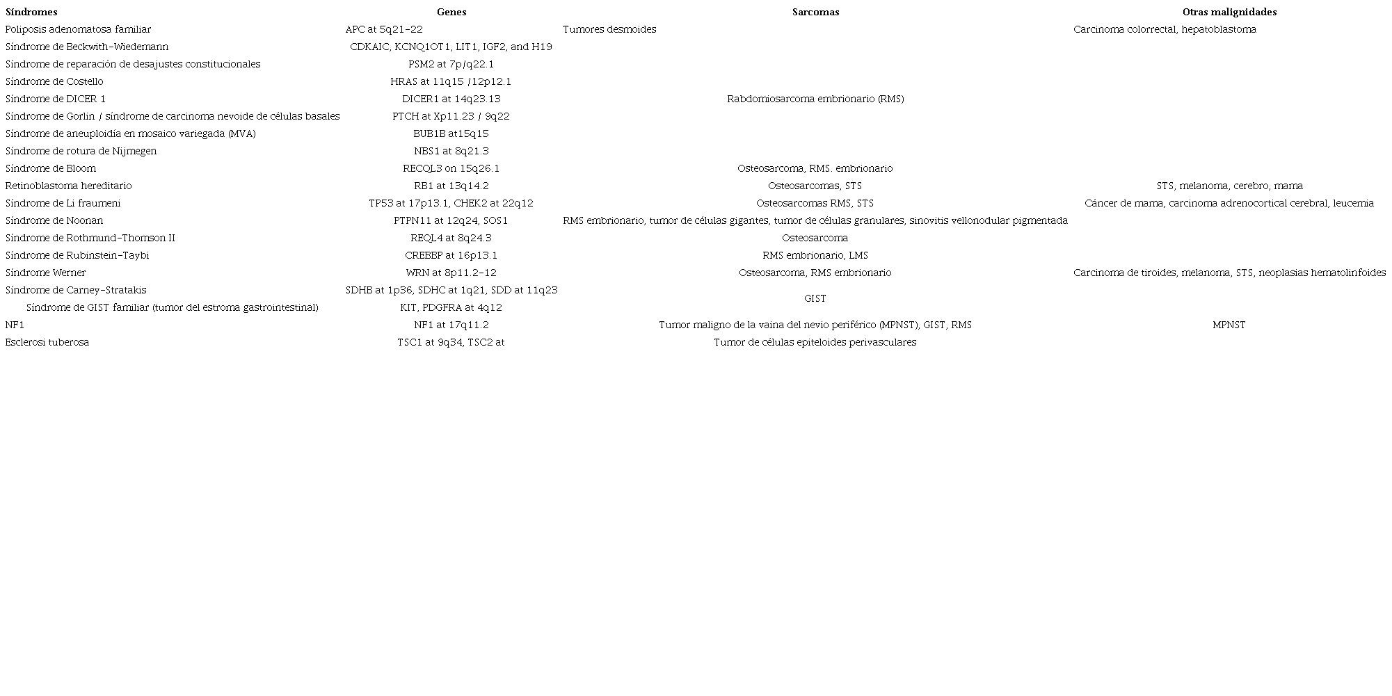 Teniendo en cuenta la existencia de nuevos y constantes cambios en la naturaleza de estos tumores, se realizó una revisión de las publicaciones más recientes para profundizar en las alteraciones genéticas, los síndromes de predisposición y su relación con los sarcomas (cuadro).