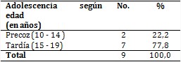 En la tabla 1 se muestra un predominio de las pacientes con adolescencia tardía (7 para 77,8 %).