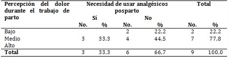 Resultados: Se halló que 7 embarazadas (77,8 %) tuvieron parto eutócico y percibieron el dolor de este como mediano; en 66,7 % no hubo necesidad de usar analgésicos y 8 de ellas (88,9 %) no presentaron complicaciones. Además, todos los neonatos tuvieron un apgar normal.