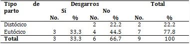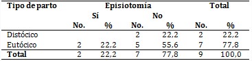 Como se observa en la tabla 3, la mayoría de las pacientes tuvieron partos eutócicos (7 para 77,8 %).