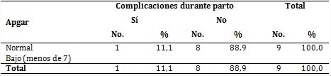 Véase en la tabla 5 que 100,0 % de los neonatos presentaron apgar normal y 88,9 % de las pacientes no presentó complicaciones tras parto o cesárea.