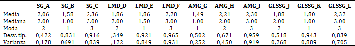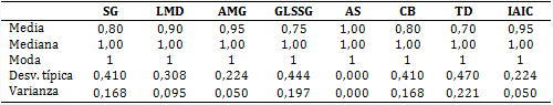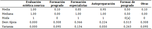 En la primera etapa, los resultados de la encuesta a los especialistas de ortodoncia evidenciaron la forma en que estos evalúan la estética de la sonrisa y la importancia que les otorgaban a los parámetros utilizados. Al determinar la confiabilidad del instrumento aplicado a estos, se obtuvo un valor del coeficiente alfa de Cronbach igual a 0,659. A partir de la variación de las medidas de tendencia central, se obtuvo que los especialistas consideraban necesaria la evaluación estética de la sonrisa para el diagnóstico y la planificación del tratamiento ortodóncico (tabla 1A), con valores de media y mediana de 1,00 y la moda de 1. Las vías fundamentales por las que habían estudiado el tema fueron en su formación como especialistas y por autopreparación.