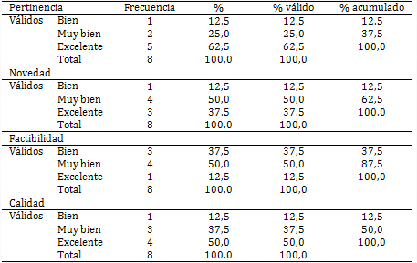 Para la valoración de la guía, se conformó un grupo de ocho especialistas de forma intencional y se tomó como instrumento una encuesta estandarizada, la cual fue entregada junto con la guía diseñada y su instructivo, a fin de que fuese valorado su contenido por parámetro, y luego emitieran su criterio según los indicadores incluidos en el instrumento de evaluación: pertinencia, novedad, factibilidad para su aplicación y calidad general de la propuesta. Se consideró aceptada la propuesta cuando 90 % de los especialistas evaluó al menos tres de los cuatro o cinco aspectos solicitados.