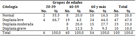 Del total de pacientes estudiados de 20 a 39 años de edad, en 33,3 % la citología fue normal y en 66,7 % existió displasia leve. El mayor número de displasias (81,5 %) figuró en el grupo etario de 60 y más años; también resultó preocupante la presencia de 10 displasias graves (tabla 1).
