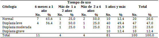 Según el tiempo de uso protésico (tabla 2), las citologías fueron normales en 63,6 % de los que habían portado las prótesis por un período de 6 meses a 1 año y se obtuvieron displasias leves solo en 36,4 %; sin embargo, en 12,4 % de los pacientes con 5 o más años de uso protésico se observaron 10 displasias graves.