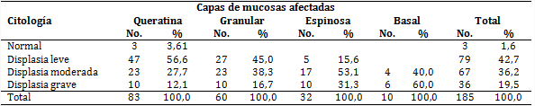 Se tomaron y estudiaron 185 muestras de la mucosa, según ubicación de la prótesis en maxilar, paladar y mandíbula; de ellas, 83 se encontraban afectadas hasta la capa de queratina, con solo 3 citologías normales. Hubo profundización hasta las células basales en 60,0 % en grado grave de displasia, con progreso en la variación (tabla 3).