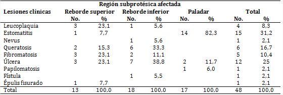 Entre los tipos de lesiones observadas clínicamente, 8,3 % correspondió a la leucoplasia, 82,3 % a la estomatitis del paladar y 31,2 % al total de las lesiones halladas (tabla 4).