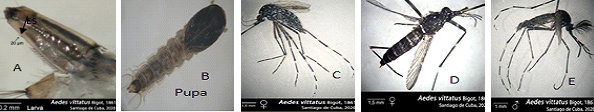 Se hizo una búsqueda en internet de las especies del género Aedes no descritas hasta el momento para Cuba y se llegaron a localizar más de 22, entre las cuales se distinguió el Aedes vittatus descrita por Bigot en 1861, con iguales características que los ejemplares obtenidos en nuestro laboratorio. Además se consultaron claves taxonómicas,10,11,12 que describen las especies informadas en otros países. Este diagnóstico se confirmó en el laboratorio de referencia del Instituto Pedro Kourí, luego de examinar ejemplares de larvas y adultos bien conservados, enviados a tal efecto.