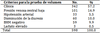 Como se aprecia en la tabla 1, los criterios más utilizados para realizar estas pruebas fueron los clínicos (57,2 %), seguidos por las cifras bajas de presión venosa central (PVC) en 16,9 %; sin embargo, la elevación del lactato, uno de los indicadores más útiles para evaluar la perfusión tisular, solo se aplicó en 3 pacientes.