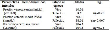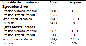 Por otra parte, la PAM y la diuresis fueron ligeramente menores en los fallecidos, sin grandes diferencias; en tanto, la PVC y la FC presentaron valores similares. Cabe señalar que después de la administración de volumen no se apreciaron cambios de interés en los parámetros en vivos y fallecidos (tabla 3).