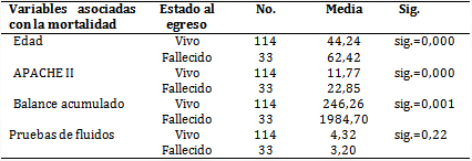 El promedio de edad de los fallecidos fue superior a los que egresaron vivos (62,42 vs 44,24 años) y la puntuación de APACHE II casi duplicó el valor en los pacientes que fallecieron (22,8 puntos). A pesar de que el promedio de las pruebas de fluidos fue similar en ambos grupos (4,3 y 3,20, respectivamente), el balance acumulado de fluidos resultó superior en los fallecidos (1 984,70 y 260 mL). En ese sentido, en una regresión logística realizada con las variables mencionadas, se demostró que la mayor puntuación de APACHE II y el balance positivo de fluidos se relacionaron con la mortalidad, lo que se mantuvo aún al eliminar el efecto de la edad (tabla 4).