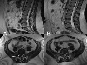 Al cabo de 8 meses se había conseguido un alivio considerable del dolor en la paciente. Dos años después de seguimiento en consulta, se realizó un estudio evolutivo de resonancia magnética que evidenció una regresión completa del disco herniado (fig. 2B).