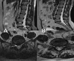 Resonancia magnética nuclear simple de la región lumbosacra: Reveló la existencia de una hernia discal centrolateral derecha, protruida, que causaba compresión radicular (fig. 2A).