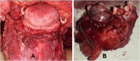 Se observó una lesión exofítica en la región anterior de la mandíbula, de aproximadamente 10 cm, que se extendía desde el primer premolar derecho hasta el izquierdo, de aspecto friable y abombada, que afectaba los huesos alveolar y mandibular, con movilidad de las estructuras dentarias e incisivos centrales y laterales, en sentido bucolingual y mesiodistal (clase III de Miller).