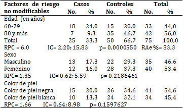 Como se evidencia en la tabla 1, la edad resultó ser el factor de riesgo no modificable de mayor asociación estadística con la aparición de enfermedad cerebrovascular, con una RPC de 6,0 y RAe % de 83,3 %; mientras que no ocurrió así con el color de la piel y el sexo (IC pasa por la unidad).