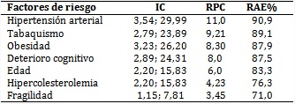 Results: The age was the risk marker of more association and hypertension was the associated disease of more relevance, for a ratio of crossed products 6.0 and 10.1, respectively.