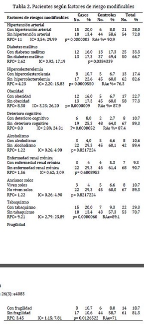 Resultados: La edad fue el marcador de riesgo de mayor asociación y la hipertensión arterial resultó ser la enfermedad asociada de mayor relevancia, para una razón de productos cruzados de 6,0 y 10,1, respectivamente.