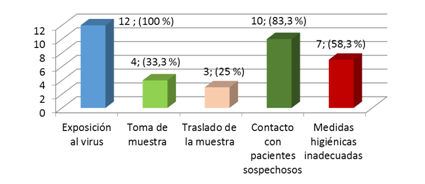 La figura 1 muestra que el principal factor de riesgo laboral fue la exposición al virus, presente en todos los integrantes de la serie, seguido del contacto con presuntos casos de contagio por el coronavirus (83,3 %) y de las medidas higiénicas inadecuadas (58,3 %).