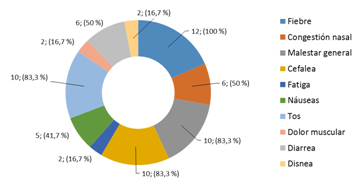 Las manifestaciones clínicas de la COVID-19 más comunes fueron la fiebre (100,0 %), el malestar general, la cefalea y la tos (cada una de estas con 83,3 %) (fig. 2).