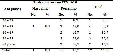 Results: In the series there was a prevalence of the female sex (91.7 %) and the 30 to 39 age group (33.3 %); most of the workers worked in the miscellany (41.7 %) and microbiology services (16.7 %) and they were mainly doctors. Those that didn't have personal pathological history were also notable (66.7 %) and those that didn't show any complication associated with the infectious process. As for the labor risk factors, all had been exposed to the virus and some had had contact with presumed infected or with patients that suffered from the disease. Among the symptoms of the COVID-19 that they suffered, fever, cough, migraine and diffuse discomfort were more frequent.