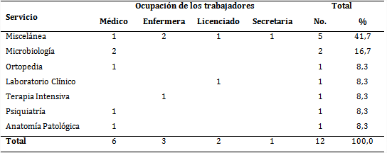 Al analizar la ocupación de los trabajadores, se obtuvo una primacía de los médicos, con 6 de ellos (tabla 2), y en cuanto al servicio donde laboraban, el mayor número correspondió al de Miscelánea (41,7 %).