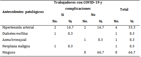 De los 15 trabajadores afectados, 66,7 % presentaba algún antecedente patológico, con predominio de la hipertensión arterial (33,3 %). Solo dos pacientes presentaron complicaciones, uno padecía hipertensión arterial y el otro varias enfermedades asociadas: hipertensión arterial, diabetes mellitus y cáncer de tiroides controlado (tabla 3).
