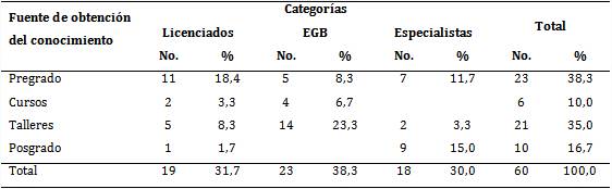La mayoría de los profesionales habían adquirido los conocimientos sobre el tema en el pregrado, con 23, para 38,3 %, donde sobresalió una cifra superior de licenciados (11, para 18,4 %); le siguieron los que habían obtenido la información en talleres, con 21 de ellos, para 35,0 %, entre los cuales predominaron los estomatólogos generales básicos (EGB), con 14, para 23,3 % (tabla).