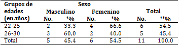 En la serie (tabla 1) predominaron los internos de 22-25 años (6, para 54,54 %) y el sexo femenino en este mismo grupo (4, para 66,6 %); mientras que el grupo de 26-30 años estuvo representado por los varones (3, para 60,0 %). El promedio de edad fue de 23 años.