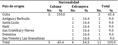 En la tabla 2 se muestra la prevalencia de los estudiantes de nacionalidad extranjera (6, para 54,5 %), con mínima diferencia en relación con los de origen cubano (5, para 45,4 %).