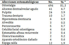 En el período analizado se realizaron 609 consultas, de ellas 556 fueron de medicina natural y tradicional, 466 obturaciones temporales, 34 exodoncias y 65 accesos camerales. Por otra parte, las afecciones más frecuentes (tabla 3) resultaron ser las odontalgias y los abscesos dentoalveolares agudos (81,3 y 6,7 %, respectivamente).