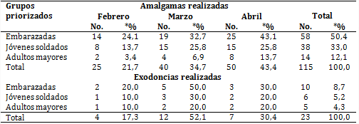 Observe en la tabla 4 que de los obturantes realizados 115 correspondieron a las amalgamas, de las que se beneficiaron 58 embarazadas (50,4 %), seguidas en menor cuantía por 38 jóvenes soldados (33,0 %), entre otros. Cabe señalar que abril fue el mes más productivo con 50 obturaciones definitivas de amalgamas (43,4 %); en tanto, las exodoncias predominaron en marzo (52,1 %), mayormente en las embarazadas y jóvenes soldados (8,7 y 5,2 %, respectivamente).