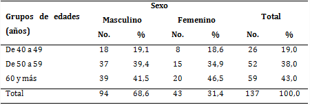 En la serie predominó el sexo masculino, con 94 pacientes, para 68,6 %, así como el grupo etario de 60 y más años, con 59 pacientes, para 43,0 % (tabla 1).