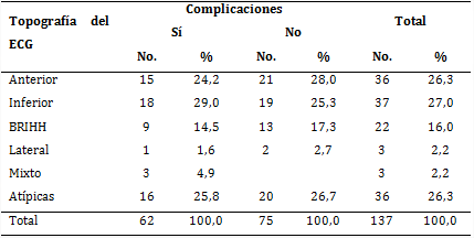 Se obtuvo una mayor frecuencia del infarto en la topografía inferior en cuanto a número de pacientes, con 37, para 27,0 %; de estos, 29,0 % tuvo complicaciones. Los pacientes con topografía anterior y presentaciones atípicas figuraron en similar porcentaje (26,3). Cabe resaltar que en 26,7 % de los afectados con topografías atípicas no existieron complicaciones (tabla 2).