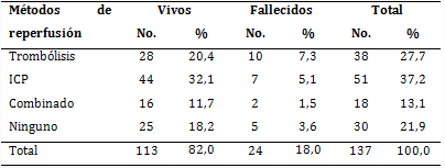 La tabla 3 muestra que la mayoría de la casuística egresaron vivos (85,0 %). El tratamiento más utilizado fue la trombólisis (27,7 %), con predominio en los pacientes egresados vivos; en tanto, 13,1 % recibió terapia combinada y 21,9 % no recibió tratamiento de reperfusión alguno.