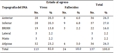 Según la topografía electrocardiográfica del IAM y el estado de los pacientes al egreso, 27,0 % mostró topografía inferior, de los cuales 20,3 % egresaron vivos. Las topografías anterior y atípicas se encontraron en igual porcentaje de pacientes (26,3), con 20,3 y 23,2 % que egresaron vivos, respectivamente. En el grupo de fallecidos las cifras respecto a la topografía anterior y la inferior fueron similares, con 6,0 y 6,8 %, en ese orden. No hubo decesos en los que presentaban topografías lateral y mixta (tabla 4).