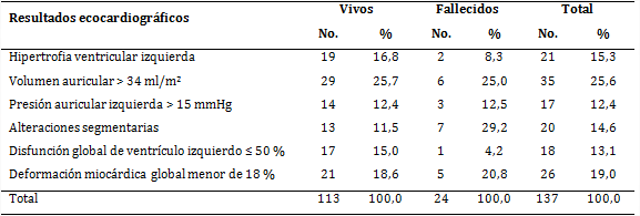Al relacionar las alteraciones ecocardiográficas y el estado de los pacientes al egreso (tabla 5), el mayor porcentaje (25,6) lo conformaron los pacientes con volumen de aurícula izquierda mayor de 34 ml/m2, seguido de 19,0 % que presentó deformación miocárdica del ventrículo izquierdo en valores iguales o menores de 18 %. Otros parámetros ecocardiográficos como la hipertrofia del ventrículo izquierdo, las alteraciones segmentarias, la disfunción global del ventrículo izquierdo y la presión de aurícula izquierda igual o mayor de 15 mmHg figuraron en 14,6; 13,1 y 12,4 % de la serie, respectivamente.