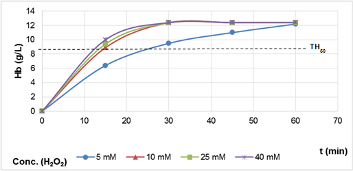 Como puede observarse (Fig.1.), el máximo de la concentración de hemoglobina que se libera con esta concentración de eritrocitos, luego de ser expuestos a las concentraciones de 5, 10, 25 y 40 mM de H2O2, se obtuvo a los 30 minutos; igualmente, al comparar los valores de TH50 obtenidos para estas concentraciones (9,1; 9,8 y 10,2 minutos, respectivamente), se determinó que no existían diferencias significativas (p>0,05). Atendiendo a estos resultados en los restantes estudios se decidió emplear una concentración del agente oxidante de 10 mM en un tiempo de incubación de 30 minutos.