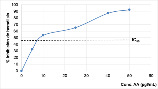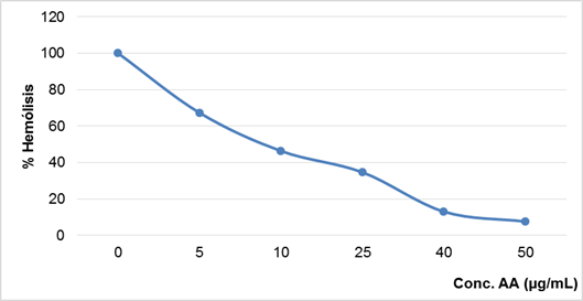 Al evaluar el porcentaje de hemólisis de las diferentes concentraciones propuestas de la sustancia de referencia (Fig.2.) se evidenció que según aumenta la concentración del AA, dicho porcentaje disminuye.