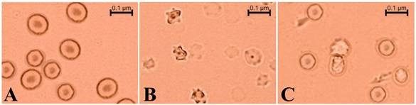 Por su parte, para precisar el mecanismo de protección de la membrana de los eritrocitos fueron observados los cambios morfológicos inducidos por el H2O2 como agente oxidante en los glóbulos rojos. Se añadió un volumen de 50 μL de eritrocitos de los pellets de cada experimento a una cámara de Neubauer y se visualizó en un microscopio de luz transmitida (Leica DM 1000, Suiza), acoplado a una cámara digital (Leica MC 170 HD). Se consideró la integridad de la membrana, la forma de los eritrocitos, además de la presencia/ausencia de deformaciones como esferocitos, equinocitos y otras alteraciones morfológicas para todas las muestras de ensayo y los controles.9,10