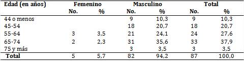 La tabla 1 muestra que, de los 87 pacientes operados de cáncer de esófago, 82 (94,2 %) correspondieron al sexo masculino y solo 5 (5,7 %) al femenino. El grupo etario de mayor incidencia fue el de 65 - 74 años con 33 pacientes (37,9 %).