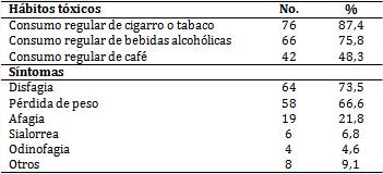 En la tabla 2 se observa un elevado porcentaje de pacientes con hábitos tóxicos. Así pues, predominaron los fumadores (76 para 87,4 %) y quienes ingerían tanto bebidas alcohólicas como café, con 61 (70,1 %) y 42 (48,3 %), respectivamente. La mayoría de los afectados revelaron que consumían bebidas alcohólicas con una frecuencia semanal y, en ocasiones, a diario, así como alrededor de una caja de cigarros y más al día.
