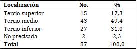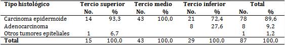 El esofagograma no ha perdido su vigencia para precisar la localización anatómica del tumor, que, como se registra en la tabla 3, predominó en el tercio medio, con 43 pacientes (49,4 %), seguido del tercio inferior, con 27 (31,0 %). Mediante este procedimiento diagnóstico no fue posible determinar la localización de la neoplasia en 2 afectados (2,3 %).